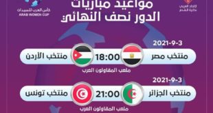 تجاوزت منافسات بطولة كأس العرب للسيدات لكرة القدم 2021، مرحلة دور المجموعات، التي ينظمها الاتحاد العربي لكرة القدم حالياً في العاصمة المصرية القاهرة، وتستمر حتى السادس من شهر سبتمبر الجاري، حيث تأهلت منتخبات الجزائر ومصر وتونس والأردن إلى الدور نصف النهائي. وتقام مباريات نصف النهائي على ملعب المقاولون العرب يوم …
